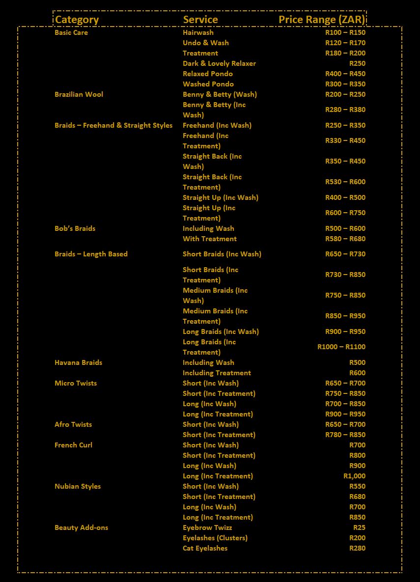 MALE GROOMING Classic Hair Cut A clean, stylish haircut tailored to your preferred look.R100 Hair Wash Refreshing shampoo and scalp rinse before or after your cut. R80 Beard Grooming Shape, trim, and style your beard with precision. R50 Line-Up Sharp edges and clean lines for a crisp finish.R50 Special Hair Cut Custom styles or fades for a standout, modern look.R150 Hot Towel Shave Smooth shave with skin-soothing treatment.R100 FEMALE GROOMING Basic Care A clean, stylish haircut tailored to your preferred look.R100 - R350 Hair Wash Refreshing shampoo and scalp rinse before or after your cut. R200 - R380 Afro Twists A clean, stylish haircut tailored to your preferred look.R650 - R850 Braids Elevate your look with braids that blend beauty, confidence, and effortless elegance. R250 - R1 100 French Curl Curls that flow with softness, shine, and irresistible feminine charmR700 - R1000 Beauty Add - ons Shape, trim, and style with precision. R25 - R280 How Much Are Our Women's Services? Download our official price list below. Price List Book Your Spot Today. Experience the difference in every detail. Schedule
